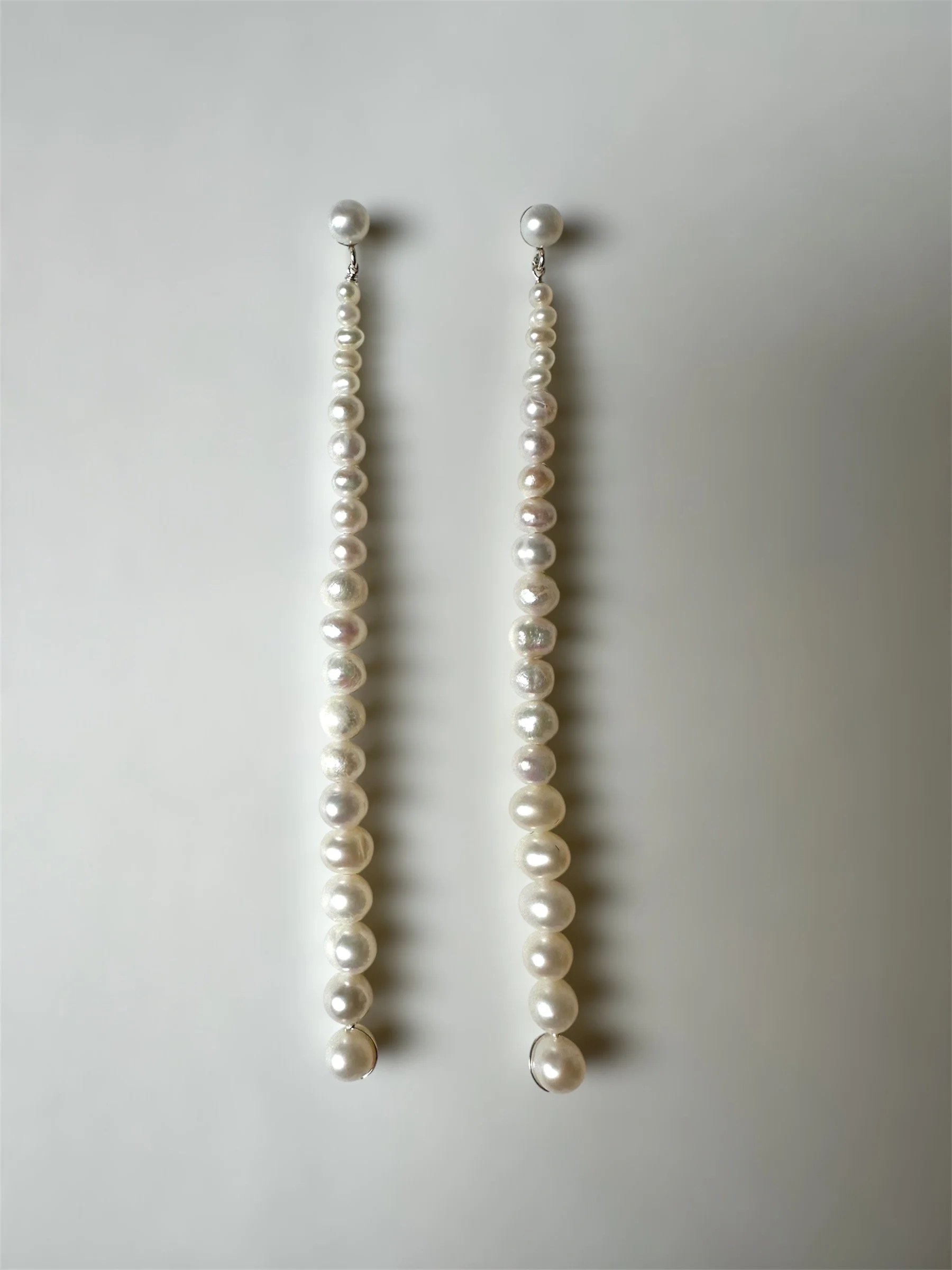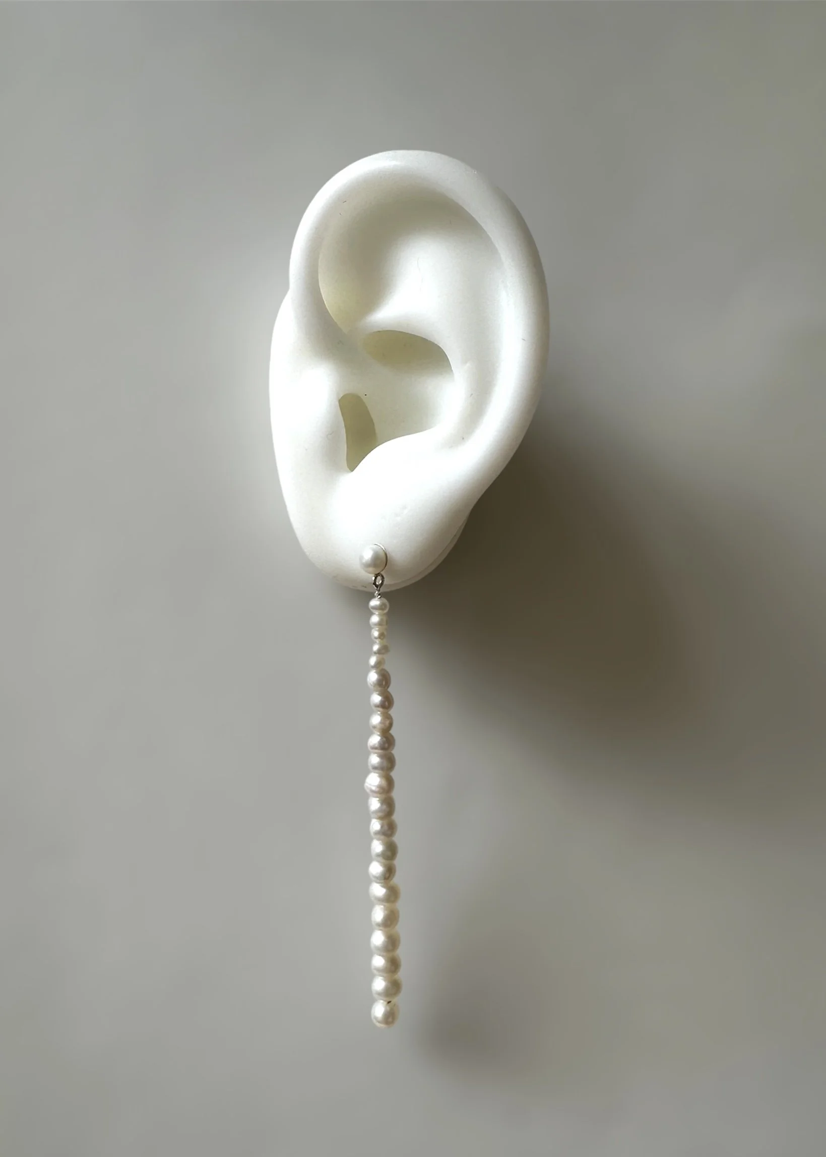 Pearl drop earrings on a silver chain embody timeless elegance with a contemporary twist.